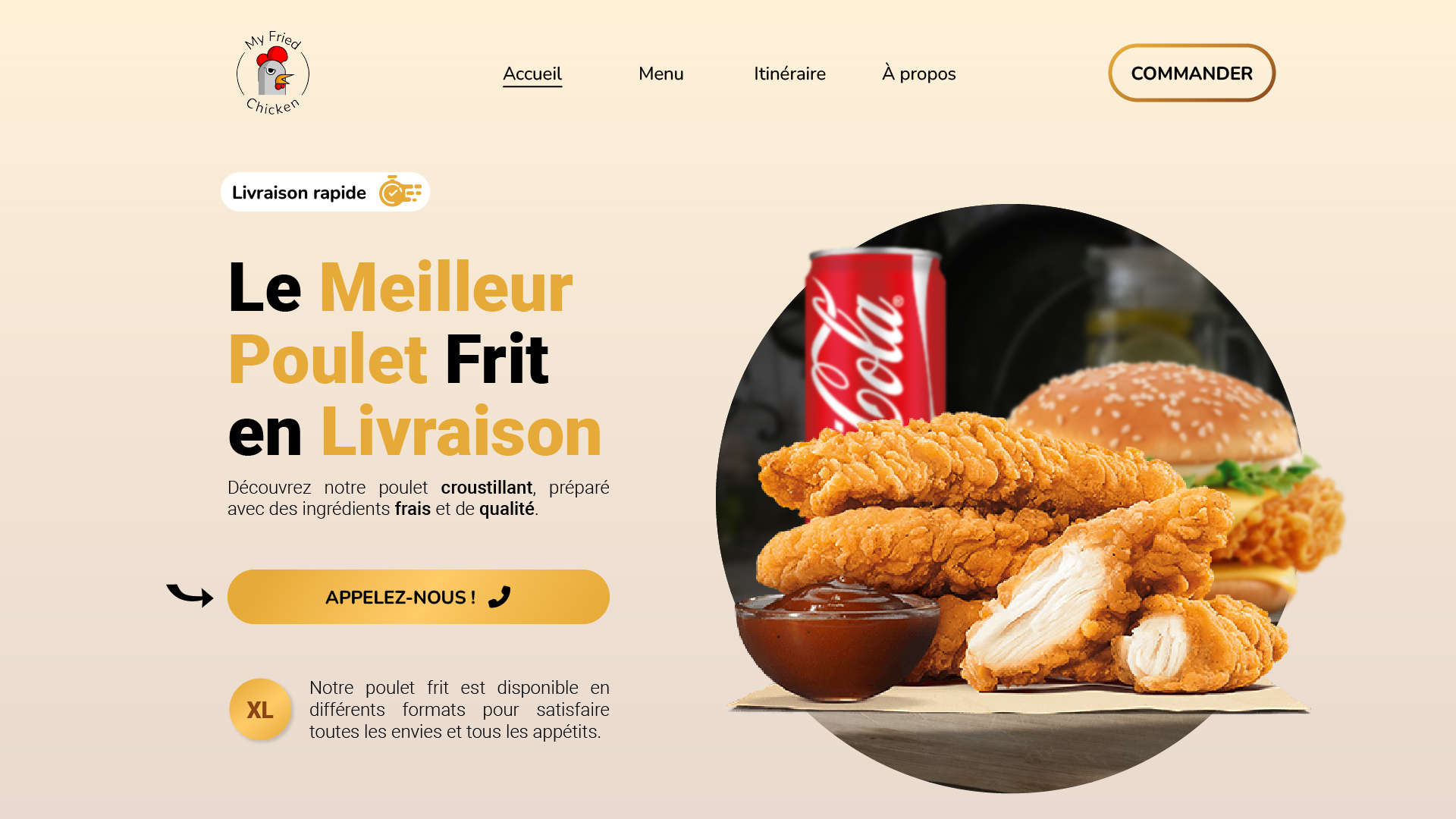 Pour le projet fictif « My Fried Chicken », j’ai créé l’ensemble du visuel de l’enseigne de street food, comprenant une charte graphique, un logo et une maquette web pour la page d’accueil et le menu.