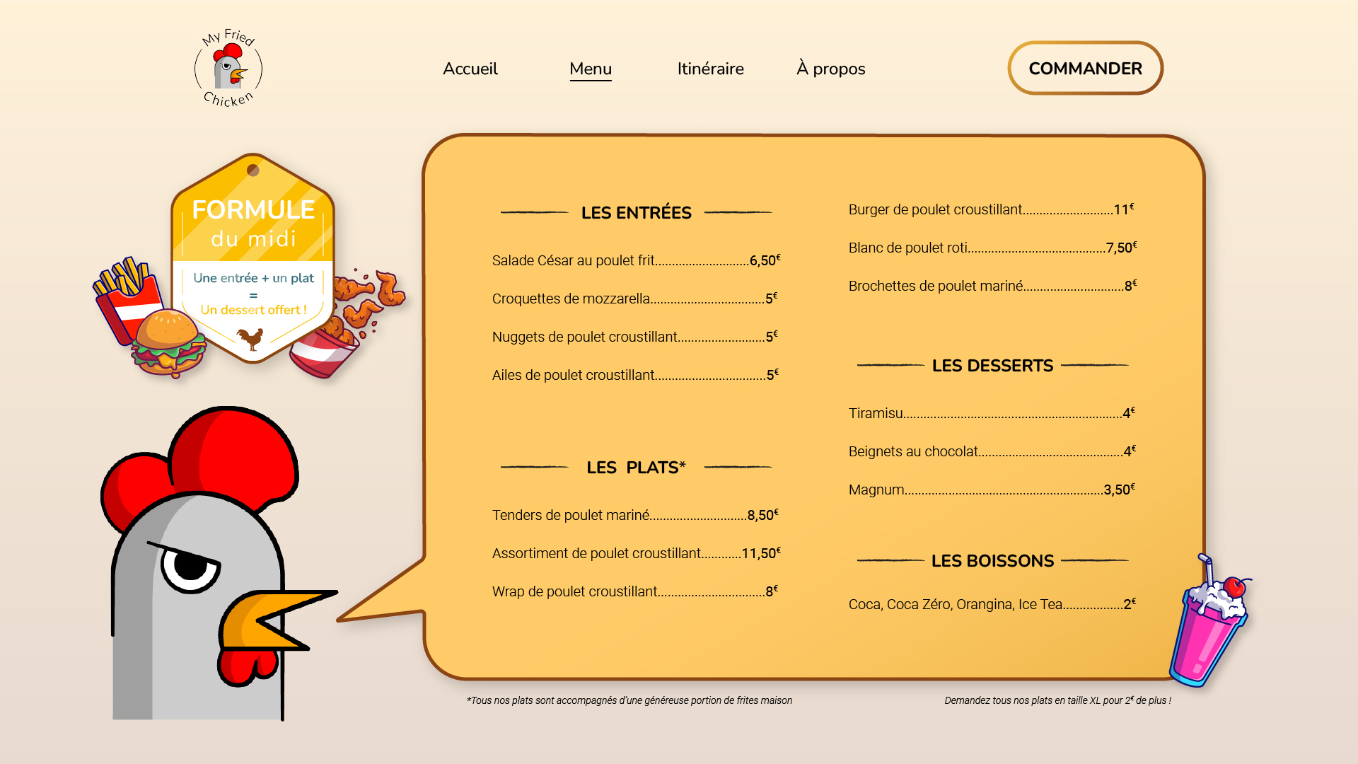 J’ai utilisé des couleurs vives et dynamiques pour la charte graphique afin de correspondre à l’esprit street food de l’enseigne, avec une typographie lisible. Le logo a été créé en utilisant une illustration d’un poulet, avec le nom de l’enseigne inscrit autour.